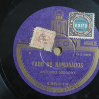 Dois selos de papel colados sobre a metade superior da bolacha: branco e vermelho, da SECTP, com o nº 95182 carimbado a preto; azul, castanho e branco, relativo à edição fonográfica em França “S. G. Int. de l’Édition Phonographique, Rue Talbout, Paris, Contrôle EDIFO Gratuit”.