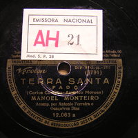 Selo da Emissora Nacional colado sobre a metade superior da bolacha com a numeração AH 21